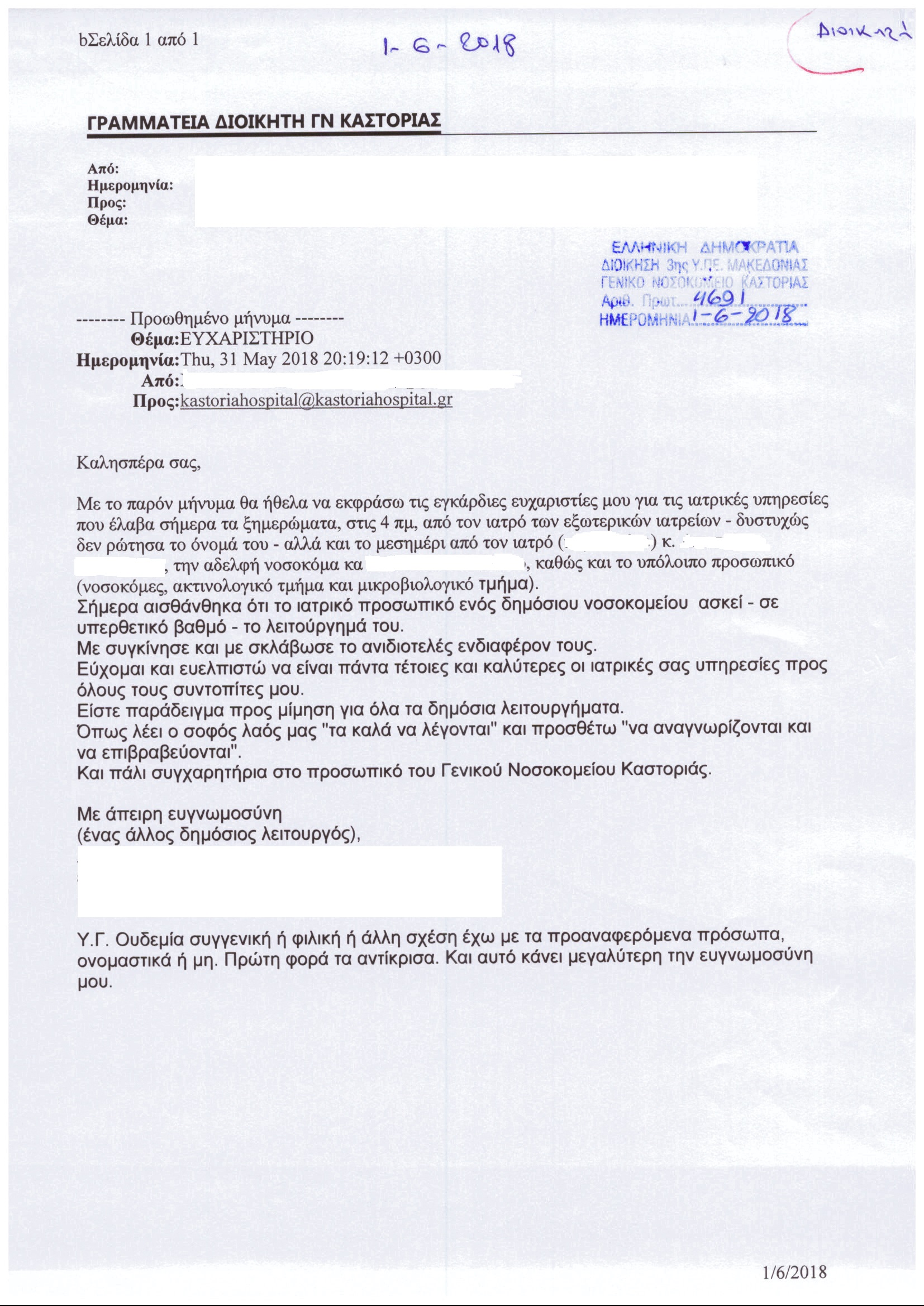 Ευχαριστήριο προς το Νοσοκομείο Ευχαριστήριο Για να προστατεύσουμε το ιατρικό απόρρητο και τα προσωπικά δεδομένα των εμπλεκόμενων, έχουν διαγραφεί όλα τα στοιχεία ταυτοποίησης. 4 Ιουνίου 2018 Ανακοινώσεις Δελτία-Τύπου Περισσότερα...