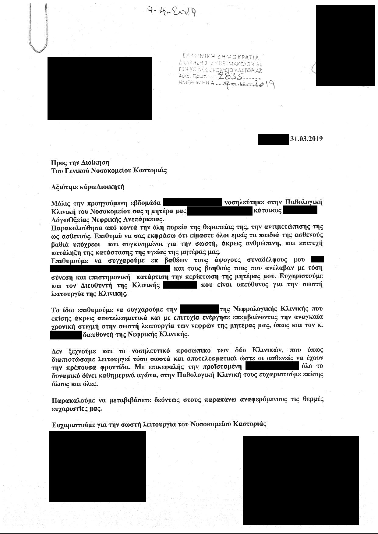 Ευχαριστήριο προς το Νοσοκομείο Ευχαριστήριο Για να προστατεύσουμε το ιατρικό απόρρητο και τα προσωπικά δεδομένα των εμπλεκόμενων, έχουν διαγραφεί όλα τα στοιχεία ταυτοποίησης. 10 Απριλίου 2019 Ανακοινώσεις Δελτία-Τύπου Περισσότερα...
